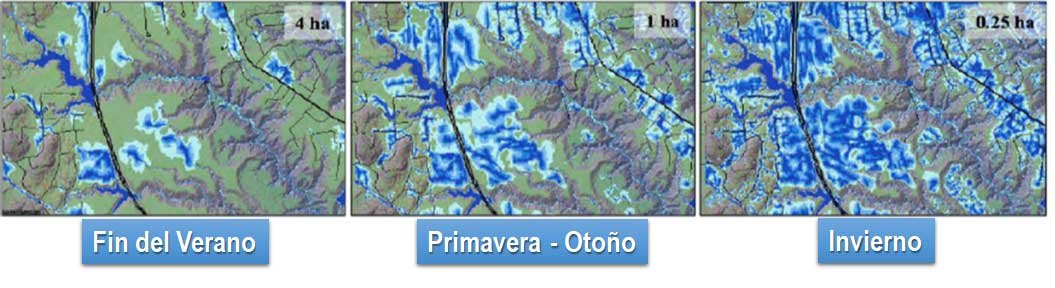 Los flujos mostrados en los mapas de DWT están relacionado con el déficit de humedad del suelo: cuando es muy bajo como después de un precipitación intensa, se usa 0,1 o 0,25 ha; Cuando el déficit de humedad del suelo es más alto para las condiciones climáticas templadas (final del verano), fijarlo en 4 ha; Esto puede variar con la textura, es decir, mayor para suelos arenosos que para suelos arcillosos