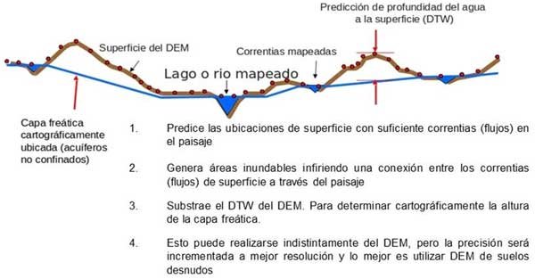 Wet-Areas-Mapping (WAM) es una modelación que permite obtener un mapeo continuo de la capa freática a una determinada profundidad, el cual, además entrega como información adicional los flujos de drenaje, y una graduación temática de los niveles de humedad del suelo y subsuelo presentes en el área de interés.